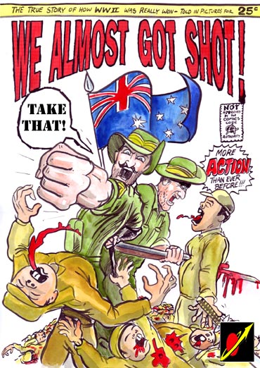 | Deep in the thick jungle of the Pacific theater of World War II, a group of Australian forces is sent on a mission to locate a missing regiment of British troops. The Japanese forces throw every one of their efficient resources at the Australians to hinder their mission. This includes transvestite ninja, bad breath and V2 Rockets made in Germany. The fighting gets dirty, the bayonets get wet, and all those corny lines from the 1970's war comics get a good dusting off !!! Based on the comic book story "We Almost Got Shot" published in 'Tales Too Twisted to Tell - Issue 2' and in Southern Aurora Comics "Australian War Stories" Anzac special edition in 1994. | ||