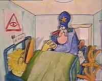 house window. Inside, a girl is restrained to her bed, possessed by a redneck